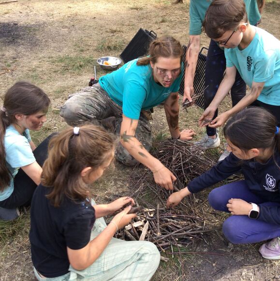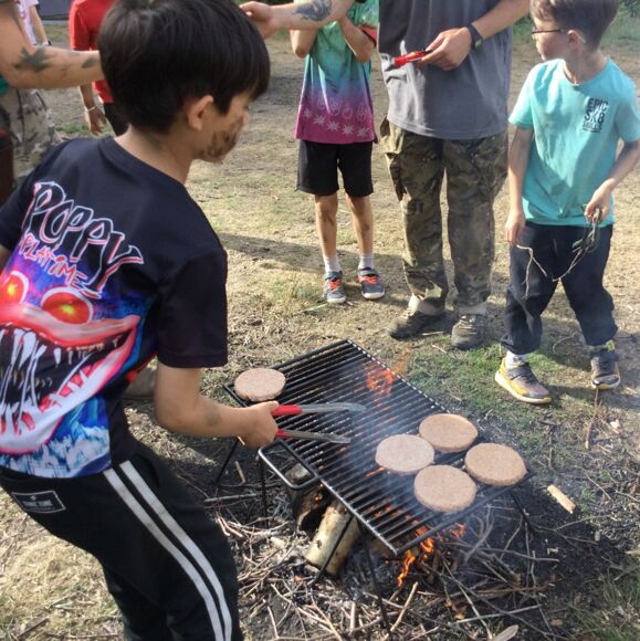 Next came one of the highlights of the trip: fire lighting. The children foraged for sticks of various sizes and learnt how to build and maintain a fire - an essential skill, especially since they were cooking their own burgers for dinner! They even remembered the golden rule: burgers must reach 75°C in the middle - 75 to stay alive!