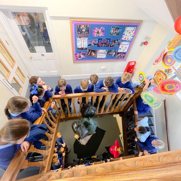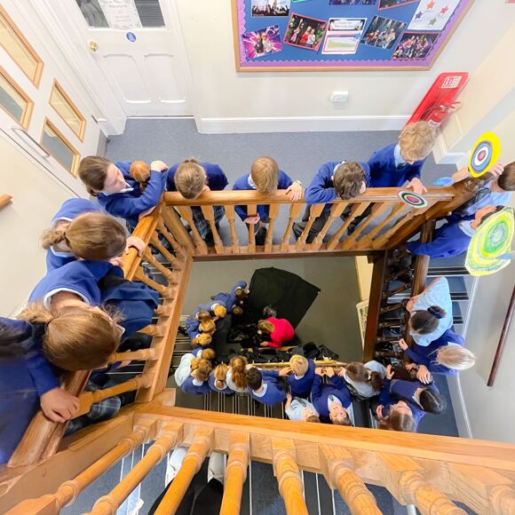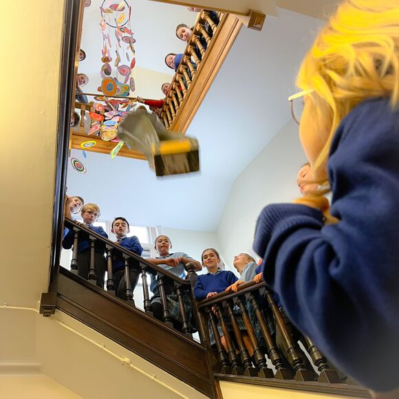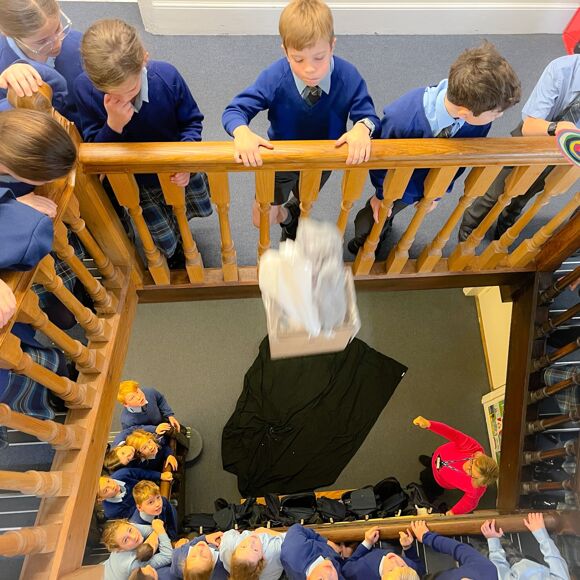 'Egg-citement' was high on the last day of the Autumn Term, for the annual Year 5 Egg Drop Challenge. Over the past halt term, Year 5 pupils have been working in teams to design and create the best parachutes and soft landings for their real eggs to survive the two-floor drop from the top of the Year 6 staircase. The children watched with anticipation from above, hoping their eggs landed at the bottom floor in one piece. It was a spectacle to watch and wonderful to see so many varied designs.