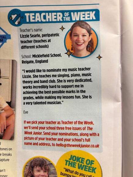 We were absolutely delighted to see our lovely Peripatetic teacher Lizzie Searle who teaches our Monday Band, Intermediate and Advanced Recorder Groups, featured as 'Teacher of the Week' in a recent edition of The Week Junior magazine.