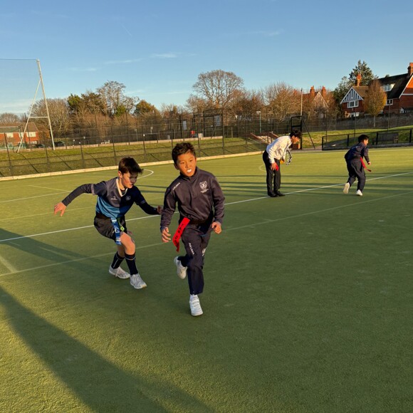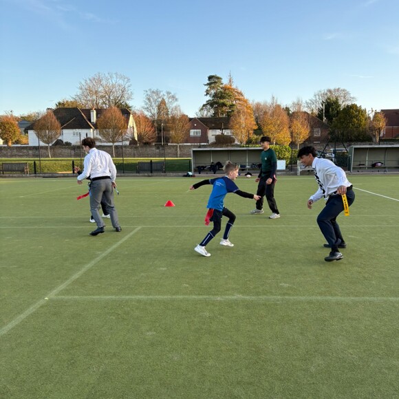 Meanwhile, the boys kicked off with a team-building challenge in the gym, using just three pieces of equipment to transport their team across the floor and back. Outside, they were joined by Sixth Form mentors for an energetic game of Tag Rugby, learning how to move their hips and dodge capture. Their impressive skills soon saw them progress to the field for some exciting rugby work.